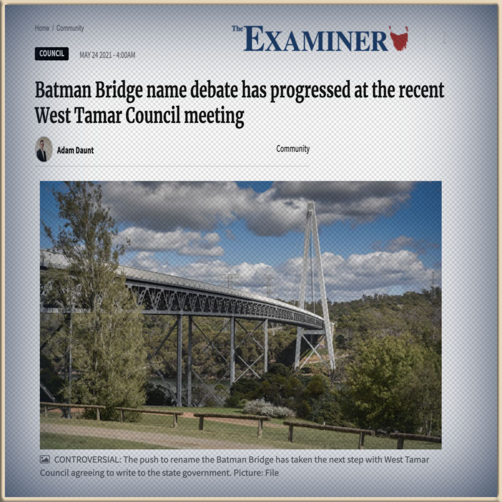 In April, Launceston council voted 5-3 in favour of their motion which seeked to acknowledge the name of the bridge is inappropriate, to write to the state government to request it begins a renaming process and to seek support from the West Tamar Council and George Town Council.